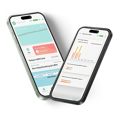 The NowZone device provides real-time insights into your state of mind - calm, attentive, stressed, or mind wandering, allowing you to track what’s decreasing or increasing, along with actions to take for faster relaxation.